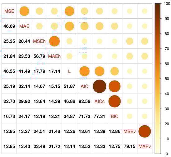 Percentage of time series where the model being selected based on a particular criterion is the same as that being selected according to another criterion. The percentages are computed in a pairwise fashion by considering the complete data set (91,444 series).