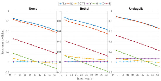 Figure 4 showcases the results of this study using the Spearman correlation algorithm. First, it is apparent that only the historical temperature and humidity are significantly correlated with the forecasting target sequences. For instance, average Spearman coefficients of and were identified for the temperature and humidity input sequences of days over all three locations. The other input features are either not correlated (e.g., year sequences) or slightly correlated with the targets (e.g., season, precipitation, and day sequences). Thus, it is reasonable to rely solely on the temperature and humidity sequences to forecast the near-future temperature values. Second, a higher correlation is seen with shorter input lengths. This is expected as these sequences can provide windows to the immediate past. With the increasing input lengths, their correlation with the targets decreases in the case of most features except for the month sequences, which seems to slightly increase its reverse correlation. Nevertheless, shorter sequences may not provide enough information to the forecasting model, leading to underperformance, while longer sequences require larger computational loads. Hence, the choice of using input sequences of elements (i.e., past 30 days) represents a good compromise between both aspects.