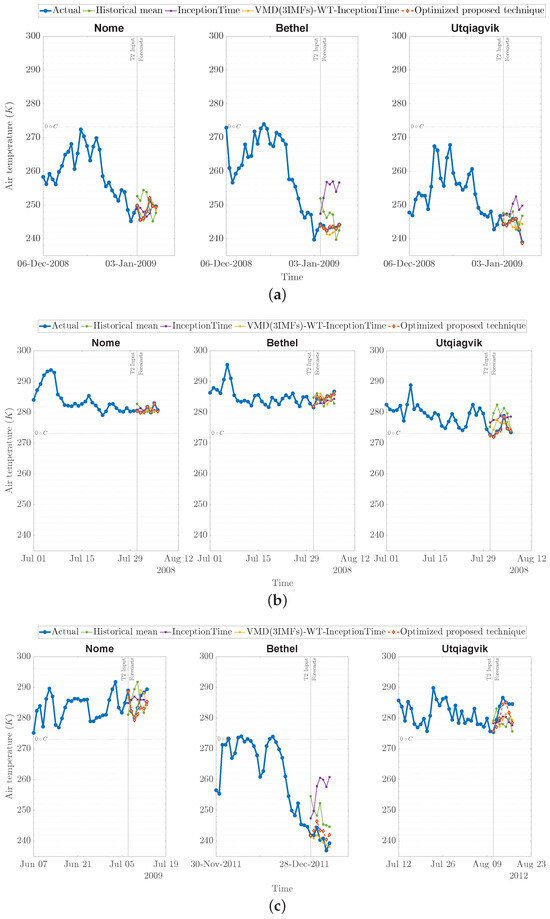 Examples of air temperature forecasts using the optimized proposed forecasting technique ( for Nome and Bethel and for Utqiavik) compared with actual measurements from the test set. Additional forecasts using the proposed technique under a sub-optimal decomposition level (M = 3), no decomposition using InceptionTime, and the historical means are shown for reference. All plots share the same vertical axis limits for comparison reasons. (a) randomly selected sequences. (b) randomly selected sequences. (c) the worst performance.