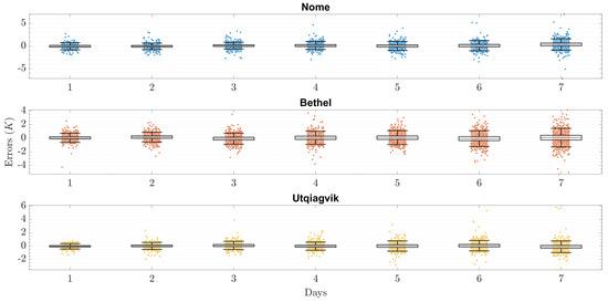 Further insights can be gathered from Figure 9, which reports a boxplot of per-horizon errors of the proposed technique employed using the optimal M for each of the three locations. First, it is apparent that the average errors at each horizon are very low. In particular, the optimized proposed technique for Nome produces forecasts over all seven horizons with a maximum error of , a minimum error of , and an average error lower than ; for Bethel, a maximum error of , a minimum error of , and an average of ; and a maximum error of , a minimum error of , and an average of for Utqiagvik. Nonetheless, slightly higher errors can be seen with higher horizons. This can be attributed to the fact that the forecast uncertainties tend to increase as the horizons get further away in the future.