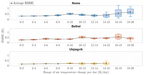 RMSE performance distribution of the optimized forecasting technique, segmented by the range of daily air temperature changes. The forecast and observation sequences were binned into intervals of by computing the amplitude change between consecutive pairs of days (K/day). It is noteworthy that even under rapid air temperature fluctuations, the technique is capable of producing forecasts with low RMSE values at all three locations.
