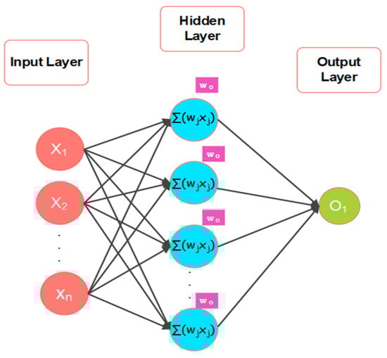 ANN models are built on the concept of neurons that interact by transmitting signals through weighted connections to one another []. These networks emulate the way biological neurons exchange information in the brain []. In ANN models, each neuron is connected to all preceding neurons and passes the layers through links. In the input layer, each input value is treated as a neuron. To enable the success of an ANN, all input values are initially weighted, and the weighted values are then processed within the hidden layers, where each neuron generates output values. This process allows ANNs to learn and make predictions or classifications based on the weighted inputs and the network’s architecture. The output value of the neuron can be represented by the formula: