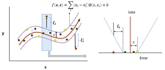 SVR is centered on the principles of statistical learning theory and the rule of structural risk minimization []. It has proven to be highly effective for modeling and predicting non-linear systems by minimizing the upper limit of generalization error []. The SVR model can be expressed mathematically as follows: