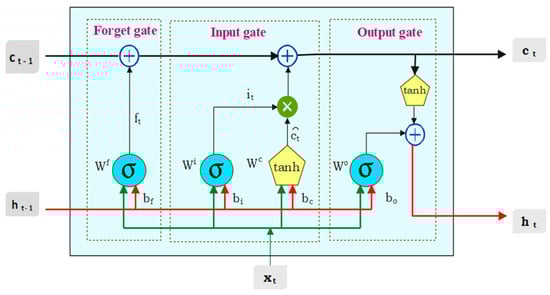 The LSTM incorporates a cell state that traverses the network, allowing information to be added or removed through gating mechanisms. Thus, the LSTM model is structured around three vital gate mechanisms: the forget gate, input gate, and output gate []. These gate structures serve as the fundamental building blocks of the LSTM, empowering it to effectively process and forecast important information, even when dealing with long-term time intervals and temporal delays in time series data []. The architecture of the single LSTM cell is presented in Figure 3.