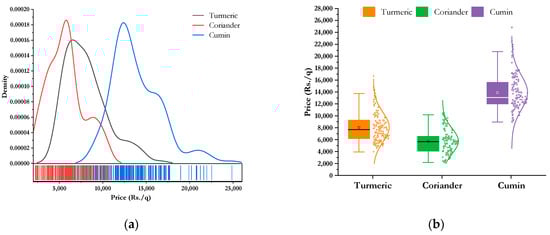 where N is the number of markets in that commodity and t is time period. The price patterns of three spices are illustrated in Figure 4. The dataset consists of a total of 156 observations across all commodities. The final 29 observations were set aside for testing and post-sample prediction, leaving 127 observations for model development in each case. Table 1 represents the descriptive statistics of different commodities. Table 1 indicates that all the prices series were non-normal and have high kurtosis. The Jarque–Bera test and Shapiro–Wilk’s test are statistical methods employed to evaluate whether a dataset follows normal distribution. The null hypothesis of both the tests are that data follow a normal distribution. It is inferred from the table that all the three commodities are non-normal. The variability in price is less for cumin as compared to other two spices. The kernel density and the box-plot of different price series are plotted in Figure 5. Figure 5 also demonstrates high kurtosis and positive skew.