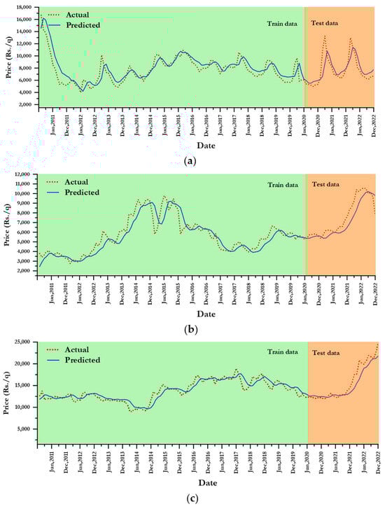 Actual and predicted values of the best fitted model for price series of (a) turmeric, (b) coriander, and (c) cumin.