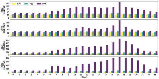 Figure 1 to not exceed 100 CAD/MWh at any hour of the day. Conversely, the P90 shows drastic changes when comparing between the years of 2019 and 2020 (e.g., approximately between 125 CAD/MWh and 100 CAD/MWh) against 2021 and 2022 (e.g., approximately between 500 CAD/MWh and 800 CAD/MWh). The diverse high price dynamics, as shown in