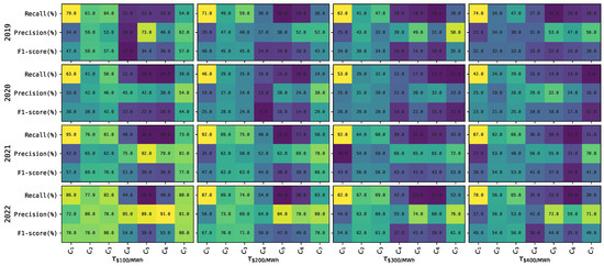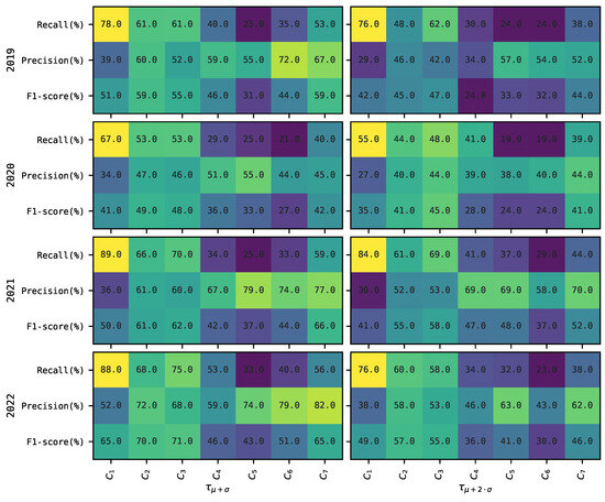 to decrease their performance as the value of the threshold increases. For example, for most of the years, performance metrics, and threshold