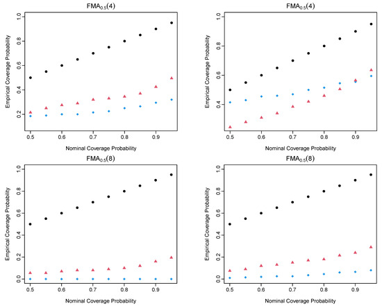 Empirical vs. nominal coverage probabilities of the four FMA processes when (left column) and (right column).