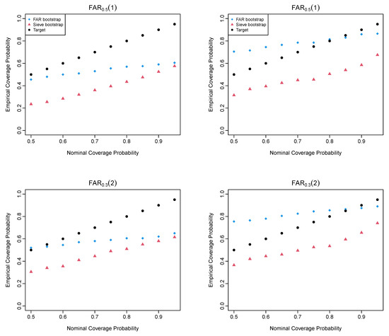 Empirical vs. nominal coverage probability of the FAR processes when (left column) and (right column).