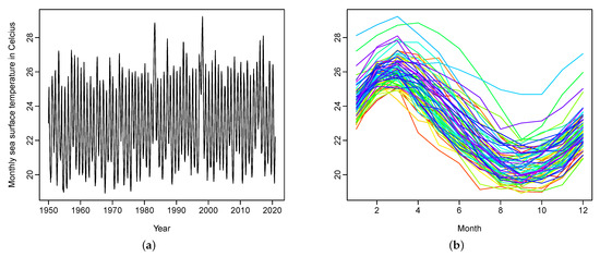 where denotes 12 discrete data points within a year. A univariate time series display of the monthly sea surface temperature is given in Figure 4a, with the same data shown in Figure 4b as a time series of functions.