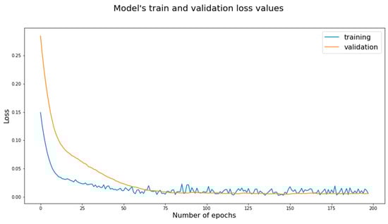 The model’s training and validation performance were analyzed through the loss values obtained during both training and validation steps (Figure 2). To avoid overfitting, we implemented an early stopping function with patience equal to 50. The obtained model was trained with a total of 198 epochs and presented loss values equal to 0.006 for both training and validation (Figure 2).