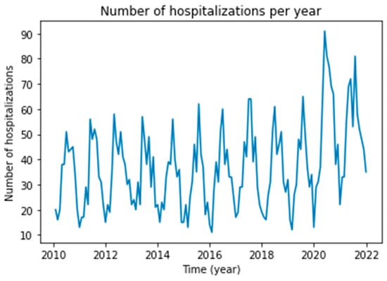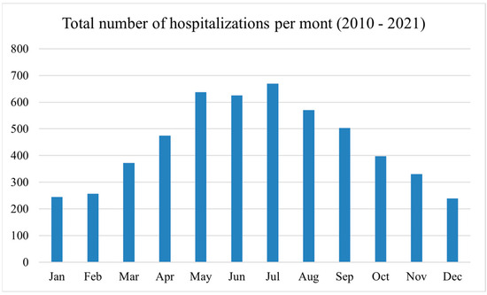Total cases of ATV–related hospitalizations per month for the period from January 2010 to December 2021.
