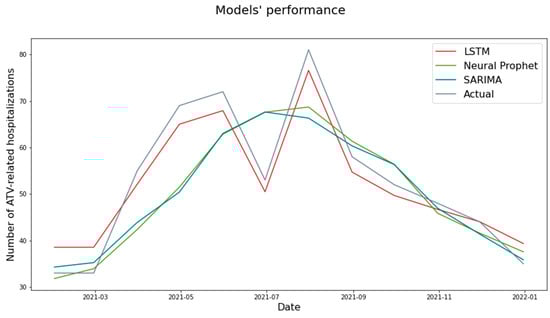 In contrast to the previous models, LSTM has strong capabilities in processing non-linear and unstable data [13,44], which explains its superior performance in predicting ATV-related hospitalizations (RMSE = 3.71). Similar results have been reported in a previous study. Feng et al. [13] used the LSTM, SARIMA, and Prophet models to predict the number of road traffic incidents in Northeast China. Due to the non-linear nature of the data and the presence of disturbance within data, it was observed that the LSTM outperformed the other models.