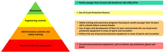 The findings of this study highlight the need for developing and implementing effective safety guidelines and prevention programs to reduce the number of ATV-related hospitalizations, which has a clear seasonal trend. We identified key characteristics of ATV-related hospitalizations, including demographic characteristics, locations of incidents, and seasonal trends, which could inform stakeholders (e.g., funding agencies, hospitals, and insurance companies). According to the data analysis, the majority of the ED visits occurred during the summer months, with a peak in July. Moreover, a high incidence of injuries among youth younger than 16 years old was reported, and areas of sports and recreation were among the leading locations in number of hospitalizations. These findings suggest that targeted prevention programs should be implemented during the summer season to reduce the incidence of ATV-related injuries. A hierarchy of controls was used as a guideline to identify possible solutions for the incident patterns reported in this study [45], as illustrated in Figure 6.