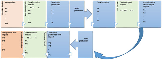 After examining the several studies carried out, an integrated scheme (see Figure 1) was adopted to describe the steps followed in this approach, in which the final demand for employment would be conditioned by the specific intensity of the tasks performed by workers and by the estimated impact of new technologies on each of these tasks.