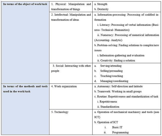 The “task-based” approach is a granular model used to identify the relations between workers and technologies and to connect skills, tasks, and technologies [30,31]. In this kind of model, workers’ skills and tasks performed in an occupation are distinct [37,38,39]. To perform tasks, laborers combine skills such as strength, reasoning, and creativity. This means that different skills come together to determine how well tasks can be performed. When we loosen the direct link between skills and tasks, we can better understand why workers with different skill levels perform different jobs, especially as the technology, demand and available workforce change. With this understanding, we can explore how technology both replaces and completes different skills needed for specific tasks in more depth [30].
