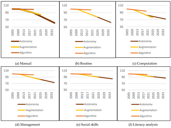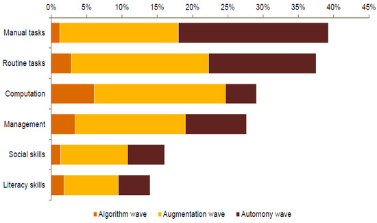 The Hawksworth et al. [15] report was used in this work to quantify the technological impact. It presents the total influence of each wave (algorithm, augmentation, and autonomy) on the different tasks performed by workers as shown in Figure 3.