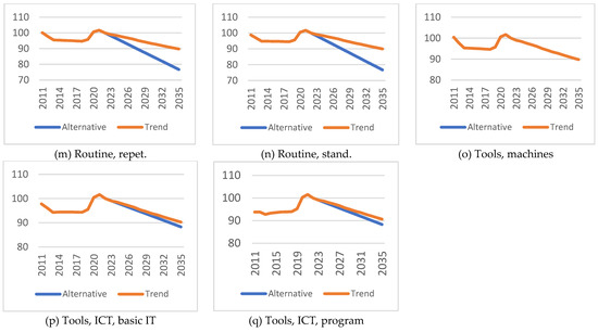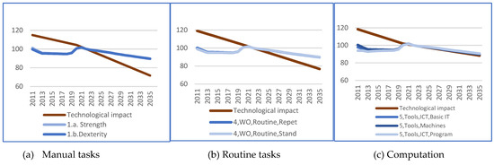 The combination of the impacts of these three waves generated the technological scenario. The following graphs in Figure 5 show the evolution of the specific intensities (in percentages) of several tasks calculated for total employment between 2011 and 2035.