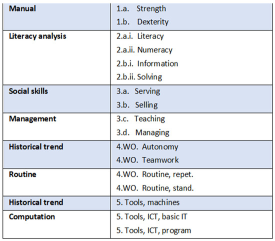 The matrix of intensities of tasks performed by type of occupation is given in the Eurofound [14] report (see Table A1 in the Appendix A). A total of 17 tasks are described, grouped into two main categories, by type of profession classified according to the CNO 2011 (military professions were not taken into account). Figure 2 shows the tasks by type of work and their organization as follows.