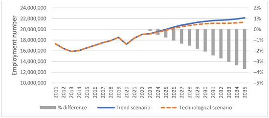 The objective of this paper is to analyze the potential impact of technological progress on employment demand by occupation in Spain from 2023 to 2035. It seems interesting to treat the case of this country because the Spanish economy is undergoing several transformations, especially after the financial crisis in 2008. In addition, it is one of the most industrialized countries in Europe with the highest robot density [5,11,17]. Finally, the data are available in the Labor Force Survey (LFS) provided by the Spanish National Institute of Statistics (Instituto Nacional de Estadística; INE). We chose to analyze trends up to 2035 for several reasons. First, it allows for a long-term perspective on the potential impacts of tech nological change on employment. This extended timeframe enables us to capture the gradual shifts and emerging patterns in the labor market, providing a more comprehensive understanding of the dynamics at play. Second, by extending the analysis to 2035, we can project the probable technological advancements and their implications for the world of work. This allows for a forward-looking assessment of how technology might shape job creation and skill demands and subsequently anticipate potential changes in occupational structure in Spain over the coming years. Finally, long-term projections can inform policy planning and decision-making by policymakers and employers. This can help them anticipate the future challenges and opportunities related to technological change and design effective strategies to enhance workforce skills. All of these described reasons show the importance of the current investigation.