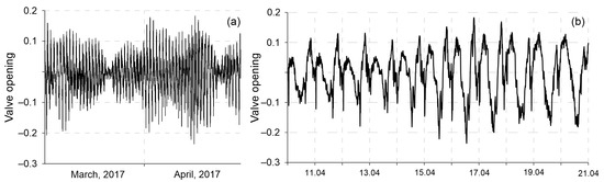 The entire data set (except for anomalies) was divided into intervals from one to five days, with a shift from one minute to an hour. Within each interval, with the exception of the last interval (from one minute to an hour), the models were trained with different data averagings. The final set of variable parameters common to all models was as follows: averaging time (from 10 s to 30 min), number of prediction points (or interval) (from 1 to 6 or from 1 minute to 1 hour), and training sample size (from 1 to 5 days). Multiplying the averaging time and the number of prediction points gave the forecasting horizon (in minutes). The data decompositions studied earlier in the work [21] were used to select the seasonality period parameter required for the Theta and Prophet models. The published article provides a description of the methodology and a detailed analysis of the results. Note that based on the results of the decomposition analysis of the valve opening value (Figure 2), the daily seasonal component of the model was identified (Figure 2b). For the Theta model, the additive method of combining theta lines was used. For the Croston method, the classic version was chosen.