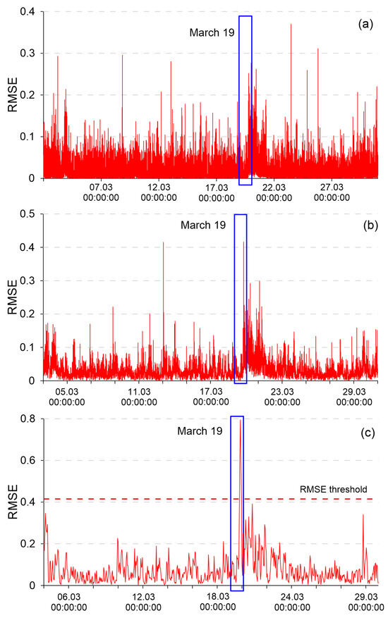 Figure 5 shows the RMSE values and their fixed thresholds for highlighting the anomaly on 19 March 2017.