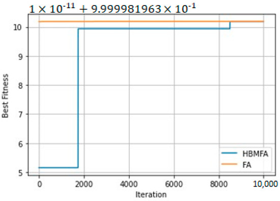 Furthermore, convergence graphs and box plots of the CEC benchmark functions over independent runs were generated to gain deeper insights into the optimization process. Figure 9, Figure 10, Figure 11 and Figure 12 depict convergence charts illustrating the progression of the relevant function’s best fitness value over iterations or function evaluations for both HBMFA and FA algorithms. These figures provide visualized information about their convergence behavior and speed. Additionally, Figure 13 shows box plots summarizing the distribution of the CEC functions’ values obtained from multiple independent runs of the algorithms, allowing for a quantitative assessment of their performance in terms of solution quality and robustness.