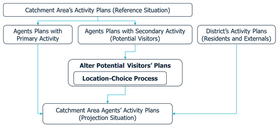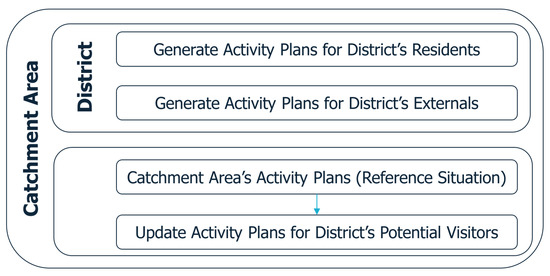 Overview of the proposed approach to generate activity plans in the projected situation at the district and catchment area levels. The activity plans of district residents and externals are first generated. In parallel, the activity plans of the agents in the catchment area are generated in a similar way to the reference situation, while for potential visitors, new plans will be included with a secondary activity performed in the district.