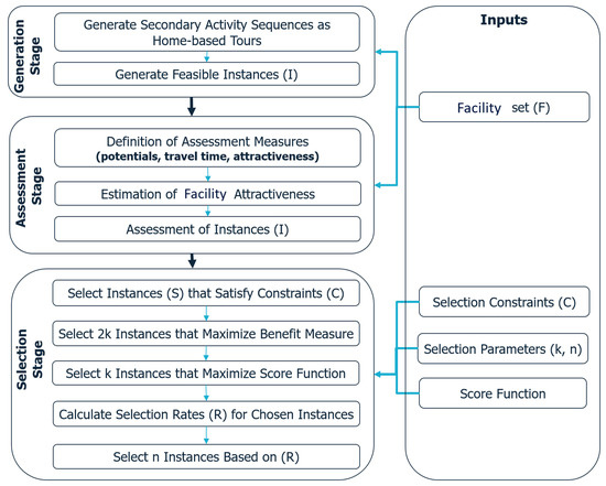 The initial step involves generating all feasible instances of activity sequences for secondary activities. These sequences, including home activity, are then transformed into home-based tours, with the home as both the first and last activity. Each activity sequence is further transformed into a location sequence, instantiating each activity at all available facilities. This process generates a relatively high number of instances, which can be controlled by applying specific constraints, such as predefined combinations and facility restrictions.