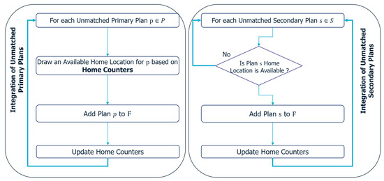 In some instances, certain primary and secondary plans may remain unmatched by the end of the matching process, meaning that they have not yet been included in the final set. To address this situation, an integration process can be used. This process systematically incorporates these unmatched primary plans, followed by secondary plans, into the final set F, while adhering to the various constraints associated with the facilities involved.