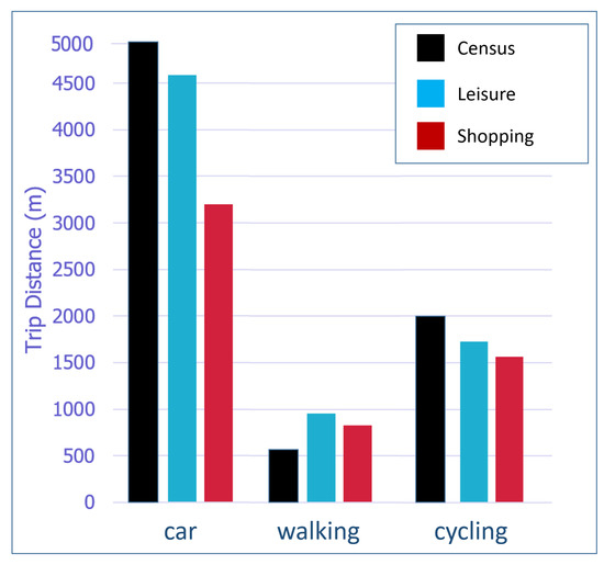In summary, it becomes apparent that leisure trips tend to be relatively longer than shopping trips. The differences are moderate, with a 10% variation for active modes and an even greater 30% difference for car trips.