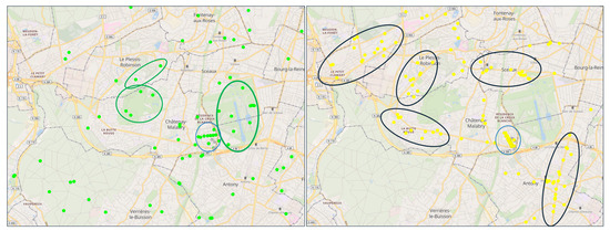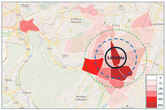 Distribution of visitors to LaVallée according to their home location and grouped by IRIS zones. The area circled in black covers visitors who reside near LaVallée (500 m radius), while the areas circled in blue and green gather the most visitors, who have easy access to LaVallée.