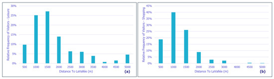In contrast, shopping facilities are abundant, encompassing both small and large areas, and they are well distributed across the study area, often grouped in clusters. For instance, considering the same home-to-LaVallée distance (more than 1.5 km), only 15% of visitors opt to visit LaVallée for shopping. This lower number of shopping visitors can be attributed to the fact that LaVallée is relatively distant from their residences compared with their original shopping facilities.