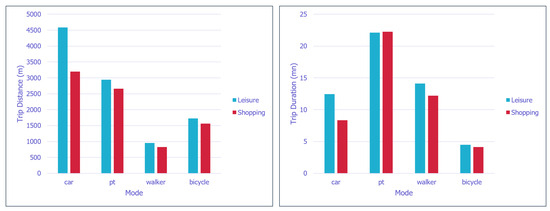 To address this question effectively, we need to explicitly consider specific travel metrics. These include measures such as average travel time and average travel distance categorized by mode of transport. Consequently, we apply these selected measures separately to leisure and shopping trips, with the aim of highlighting the differences in metric values between these two types of activities.
