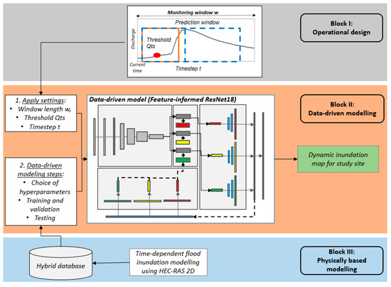 The first block deals with the operational design. A specific time period is defined within a monitoring window . Within this window, a future/predicted hydrograph is listed, which forms the basic input for the inundation forecast later. The length of this window is also the maximum lead time for the multi-step forecast. The hydrograph within this window moves with a specific timestep towards the current time. As the inundation forecast does not have to be carried out continuously, a threshold value can be set for the start of the forecast. These three parameters (length of the window , timestep , and threshold ) provide the operational settings for the forecast system. Once a forecast is started, for each possible timestep within the window, the respective inundation map will be generated. It is worth mentioning that the operating design must be defined in advance but can be adapted to meet the requirements of the application in any study area. In this study, the length of the forecasting window is set to 24 h, the discharge threshold is set to 25 m3/s, and the timestep is set to 1 h. A detailed description of the forecast strategy is presented in Section 2.2.