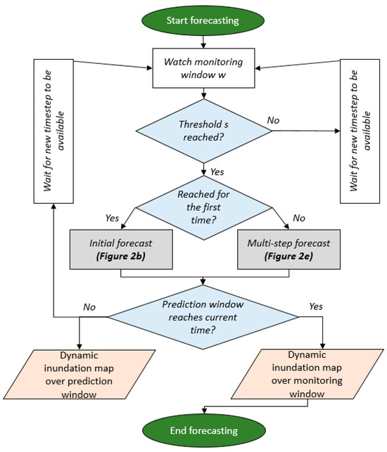 This multi-step forecast is carried out until the new prediction window is at the current time of the monitoring window , concluding with a dynamic inundation map, starting with the initial forecast, and adding more inundation maps with the timely resolution until the maximum lead time is reached (shown in Figure 2d). The necessary algorithm and its steps for running a multi-step forecast are listed in Figure 2e. An overall algorithm for running the forecast system in operational mode is provided in Figure 3. This algorithm describes the application of the forecast system for real-world implementation.