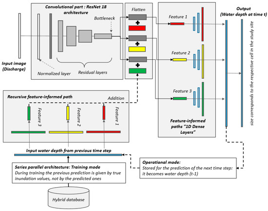 The recursive part stores the prediction from the last timestep and serves as a memory. Once more, it feeds the information through one feature-informed dense layer with the size of the flattened layer and mathematically adds the information to this layer. Thus, at this stage, the model is thereby influenced by the information of the hydrograph at the time , which runs in the convolutional part, and the inundation from , which was processed through the feature-informed paths, allowing the model to perform multi-timestep into the future.