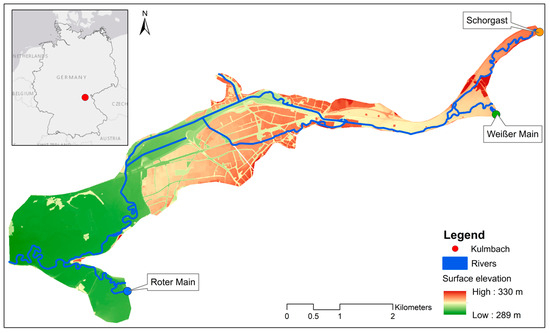 We implemented our developed methodology in the study area Kulmbach (Figure 5). The area has a size of about 12 km2 and is located in the federal state of Bavaria, Germany. The catchment area has a flow direction from northeast to southwest. Three main rivers flow through the area, namely the Schorgast, the White Main, and the Red Main. The first two flow into the study area in the northeast, while the Red Main enters in the southern part and, unlike the other rivers, flows only briefly through the area. The northeastern part is narrow and surrounded by hills, while in the western part, the catchment area becomes wider and merges into floodplains.