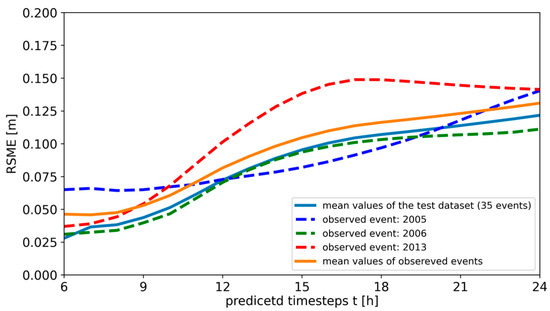 Figure 6 shows the average RMSE values for these test datasets plotted over the entire monitoring window, concluding with a prediction error for each timestep. It can be seen that all sets have an RMSE for the first 6 h below 0.07 m, which can be interpreted as an average water depth error below 7 cm over the entire study site. This error increases over time since the prediction error from t − 1 is carried on for each timestep. Nevertheless, even after 12 h, the error is still acceptable and around 0.08 m and 0.12 m. Except for the observed event from 2013, the worst predictions are at 24 h. At this stage, the error ranges from 0.1 m to 0.14 m. Overall, the prediction errors are good and always below 0.15 m.