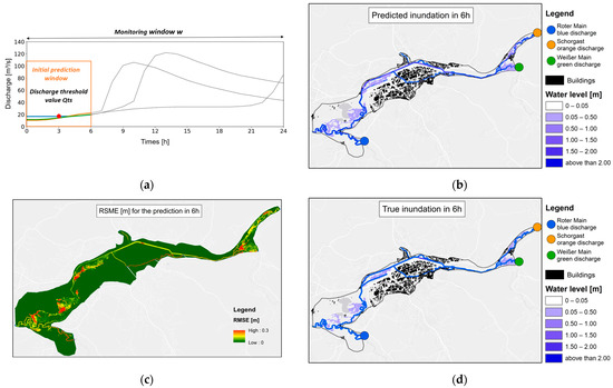 The evaluation of the forecast system for three timesteps (6 h, 12 h, and 24 h) of the observed events from the year 2006 is presented in Figure 7, Figure 8 and Figure 9, where Figure part (a) shows the used section of the hydrographs within the monitoring window, part (b) the respective predicted inundation map, (c) the true inundation, and part (d) the RMSE value of the respective cells. It is clearly visible that all predicted inundation maps are very similar to the true inundation maps, which were calculated by HEC-RAS 2D. Furthermore, the RMSE map shows that most of the respective cells have very small RMSE values.