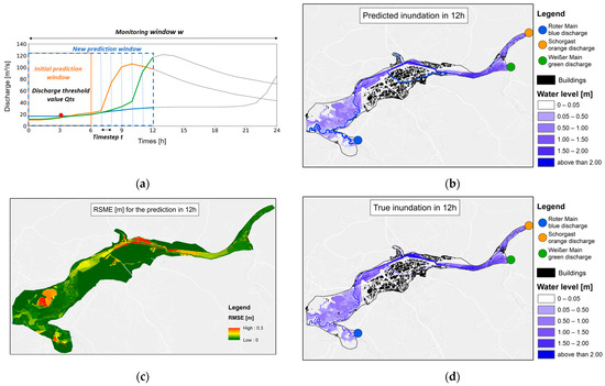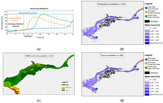 Visualization of the prediction for the next 6 h of the observed event from 2006. (a) Hydrographs within the monitoring window w, dotted timesteps are not used for the initial forecast, the orange box represents the initial prediction window, and the red dot represents the discharge threshold Qts; (b) predicted inundation map; (c) true inundation for this timestep; (d) spatially distributed RMSE prediction error.
