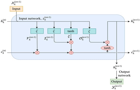 In practical terms, Vanilla LSTM excels in retaining information over extended periods. In time series forecasting, the Vanilla LSTM approach incorporates various gates, significantly enhancing its memory capabilities [,]. Let be input values and output values of the existing historical data to be forecasting, then the Vanilla LSTM network can be represented by the following basic system equations,