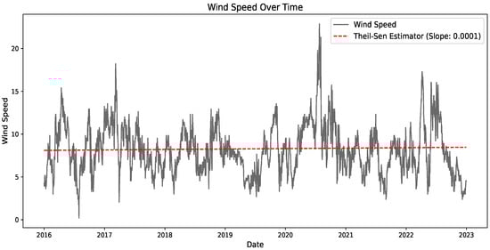 In numerous studies on time series analysis, the authors frequently employ the Mann–Kendall test to examine trends and ascertain whether there exists a consistent upward or downward trend over time. Nonetheless, in this study, an alternative methodology known as the Theil–Sen estimator is employed. This approach, pioneered by Sen and Theil [,], respectively, entails a median-based slope estimation technique. It presents various advantages over the conventional Mann–Kendall method, being non-parametric and more resilient. The Theil–Sen slope is determined by the following formula: