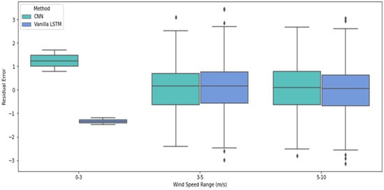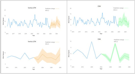 CNN is primarily known for its ability to detect patterns in spatial data such as images, but recent literature shows that CNN can be adapted to time series forecasting tasks, including wind speed prediction [,]. Chen et al. [] used a hybrid CNN-LSTM model to predict short-term wind speeds. The CNN layers were employed to extract spatial dependencies from meteorological data, while the LSTM layers were used to model the temporal dynamics. This hybrid architecture outperformed traditional machine learning methods, achieving lower mean absolute error (MAE) and root mean square error (RMSE) compared to conventional models. This method is also adopted in our study to compare it with the Vanilla LSTM, as applied by other authors to forecast different climate conditions.