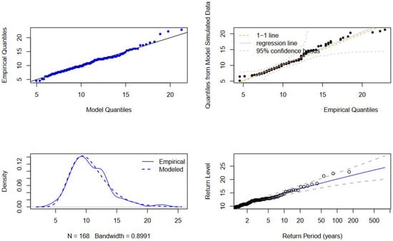 Another method for determining the optimal order size involves a comprehensive approach that combines visual inspection of the data using graphical diagnostic plots with insights derived from the results presented in Table 6. This approach particularly emphasises selecting the model with the smallest AIC and BIC values. Figure 10 presents the diagnostic plots for . These plots provide a visual assessment of the model fit, showcasing empirical quantiles against model quantiles, quantiles from model-simulated data against empirical quantiles, the density of empirical versus modelled data, and return levels for various return periods. These visual tools are crucial for evaluating the model performance and ensuring the robustness of the parameter estimates. By leveraging both statistical and graphical diagnostics, we aim to refine our model selection process, enhancing the accuracy and reliability of our extreme value predictions.