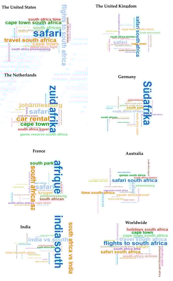 The search query for the Google Trends data for web searches was South Africa under the travel category for each source market. The related queries that fall under the travel category for each source market as well as for the worldwide search are shown in the word clouds below.