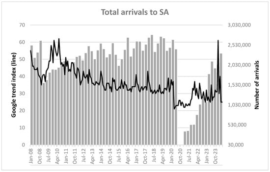 The most predominant type of Big Data found in tourism forecasting studies is web search data. Ref. [] report that web search data from Google and Baidu search engines are most frequently employed, with [] paving the way by using Google Trends data to forecast Hong Kong tourism. Since then, data from these search engines have been used to not only forecast tourism demand for countries and cities but also hotel demand []. The recent COVID-19 pandemic that disrupted tourism around the world caused a structural break in tourist arrivals to all countries. Given the impact that the recent pandemic had on the tourism industry, Big Data may prove to be an important predictor of tourism recovery in countries that are still struggling to recover. One such country is South Africa, where tourism demand is still well below its pre-pandemic levels, it having recovered just more than 80% of pre-pandemic levels by the end of 2023.