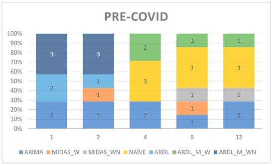 Figure 3 and Figure 4 compare the forecasting performance of the various models over the different forecasting horizons. Figure 3 shows that pre-COVID, with h = 1, 2, the MIDAS_ARDL with the Google Trends web and news search indices was the best model in three of the seven instances, with the ARIMA model and ARDL model in second and third places. Over the longer term, the naïve model was difficult to outperform, and only the MIDAS_ARDL model that included the web search Google index appeared as the best model in two instances over h = 4 and once when h = 8, 12. Figure 3 and Figure 4 compare the forecasting performance of the various models over the different forecasting horizons. Figure 3 shows that pre-COVID, with h = 1, 2, the MIDAS_ARDL with the Google Trends web and news search indices was the best model in three of the seven instances, with the ARIMA model and ARDL model in second and third places. Over the longer term, the naïve model was difficult to outperform, and only the MIDAS_ARDL model that included the web search Google index appeared as the best model in two instances over h = 4 and once when h = 8, 12.