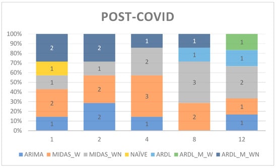 Figure 4 shows the same figure but after COVID-19, and it is evident that the models that include Google search data outperformed the other models consistently. For example, over h = 1, 2, 8, 12, five out of the seven winning forecasts included Google Trends data. For h = 4, this improved to six out of the seven forecasts.